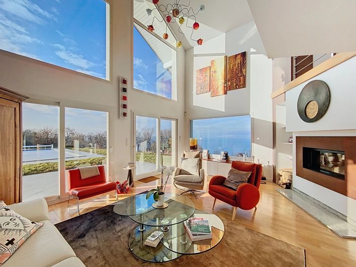 À proximité d'Évian-les-Bains, au calme dans un secteur résidentiel proche du lac, cette villa d’architecte de 2001 offre une vue spectaculaire à seulement 8 minutes du débarcadère.