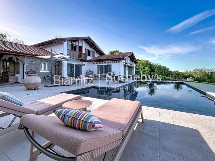 Sur les hauteurs de Larressore, à quelques minutes d'Espelette et 20 min de Biarritz, cette maison basque rénovée de 185 m² offre calme et vue imprenable sur les montagnes.