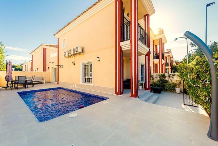 Jumelée Maison avec Piscine privée, à 700 mètres de la plage ! Cette exceptionnelle maison Maisonette de 4 chambres à coucher et 2 salles de bains est située dans le complexe résidentiel calme et vert de Monte Mar, situé dans un magnifique parc de pins à Dehesa de Campoamor. La propriété se trouve à seulement 700 mètres de la mer et des rives sablonneuses de Playa de la Glea, accessible par une route plane sans collines. La plupart de la promenade jusqu'à la plage est ombragée par de grands pins, créant une ambiance agréable et rafraîchissante. La propriété a été Rénové et améliorée, y