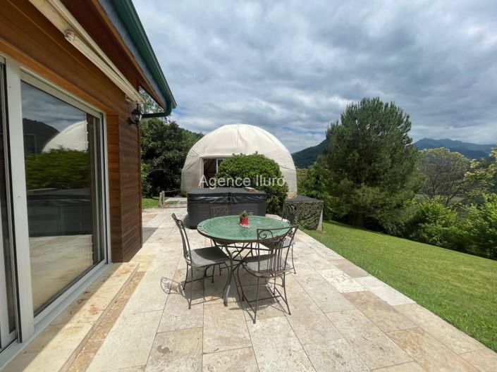 Au calme complet, sur terrain clôturé de 1 235 m² avec jolie vue sur la chaîne des Pyrénées, venez v...