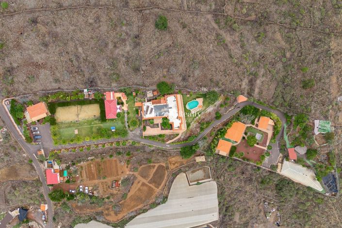 We are pleased to present this magnificent property, hotel style, located in Chío, Guía de Isora, Tenerife South.It is located at 580 m above sea level and occupies a plot of 9.100 m2 on which 10 bungalows are developed with a total built area of 874 m2.With easy access to the motorways that connect with the rest of the island. Close to Los Gigantes, Alcalá and Playa San Juan, where you can find different beaches, natural swimming pools, a variety of hotels and restaurants, as well as different nautical ports and mountain activities such as hiking and cycling, only 20 minutes from Las Américas and Los Cristianos by car. The 10 bungalows, which have been completely refurbished with modern style, quality and good taste, can accommodate more than 40 people in total. Each bungalow has its own private terrace with panoramic views of the ocean and the neighbouring islands that amaze the eye. All of them have a holiday licence (Vv). The villa also has areas for various recreational and wellness activities, as well as a large function room and a solar-heated swimming pool and an outdoor swimming pool.This beautiful estate has a natural and quiet environment, surrounded by plants and fruit trees, palm trees and magnificent views. It is simply a magical place to enjoy and relax. The property has a tennis court and parking for several cars.The property is sold fully furnished and equipped, ready to use or operate. The property is for sale, not the business. IBI: €1500/year.Asten Realty reference: 7943.