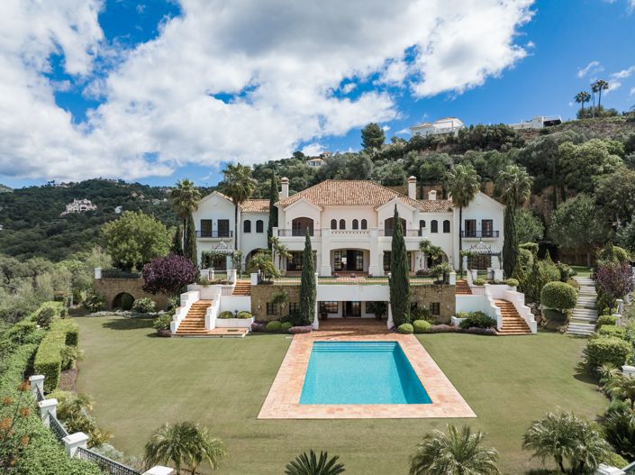 This magnificent ten bedroom Andalucian style villa sits on a large flat plot with views across the stunning countryside to the Mediterranean sea. This beautiful property is accessed via a large courtyard with a fountain as the centre piece. The main house is distributed over three floors accessed by an impressive staircase or the elevator. On the pool level there is a wine cellar, gymnasium, sauna area and cinema room, showers and a kitchen. The gardens of this home are immaculate and above the large garage is a separate two bedroom apartment with its own entrance.