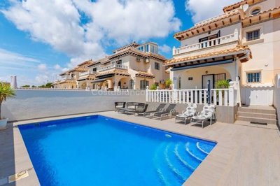 On the ground floor there is a modern living and dining room, a nice fitted open kitchen and a bathroom. Furthermore, there are 2 bedrooms, 1 with terrace ( sea views ), and a bathroom with step-in shower on the first floor. All rooms have air conditioning. There is also a rooftop solarium with sea, and mountain views. This property has a large private pool with a covered terrace and the house also has a communal pool.