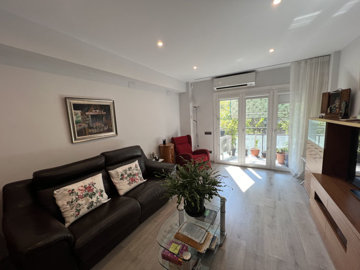 here: 97m² built and 87m² useful according to cadastre, plus an 8m² terrace .Rooms: 3 in total; two exterior double rooms and one medium-sized interior room.Living-dining room: Spacious and very bright, with direct access to the south-facing terrace, which receives direct sun throughout the day and has a folding awning.Kitchen: Open and independent, fully equipped with all appliances.Two Bathrooms: Complete, with shower.Renovation Details: The apartment was completely renovated three years ago, including the renovation of the electrical system with high quality construction materials. The windows have a thermal break bridge and are both thermally and acoustically insulating; The rooms have PVC windows with double glass chambers. The doors are solid white lacquered, the floor is parquet, and the bathroom is covered in slate stone.The property has hot/cold air conditioning with splits, alarm system and built-in wardrobes in the hall, offering good storage space. In addition, it has fiber optics.Location and Con