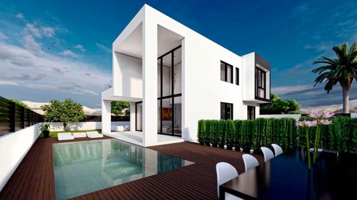 Project in Energy Certificate A class Extra large format Windows in Aluminum. Integrated designer's kitchen of prime Brand, with Dekton (or similar) worktop, Professional water taps and integrated White goods. 8 x 4 swimming pool with surrounding sun-terrace. Suspended toilet, bathroom cabinet of prime Brand, minimalist one handed taps Safety glass screens and toilet cabinet. Rainshower, Bathroom tiling in extra large format in rectified porcelanic material. Rectified Porcelanic floor tiling A+ quality of extra large format, identical interior and exterior use in anti-slip treatment. Pool finishing in similar design and color. Interior carpentry from floor to ceiling, with magnetic lock and hidden hinges. Dressing and wardrobes with interior design. Electric switches from prime Brand and design. All LED spotlights in ceilings and exterior included. Water heating by Aerothermia. Fully installed Air-Co ducted. Video-porter with automatic opening, courtesy lights, drive way for three cars. Safety door. Basement finished identical to the villa.