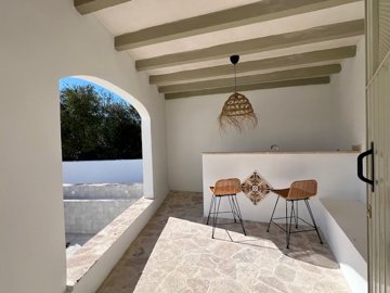 A detached Chill-out/Bar/Kitchen, with built-in Moroccan style seating overlooking the sumptuous salt-water swimming pool, with in-built seating, a shower area and dining space.