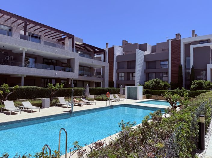 Discover this beautifully presented, furnished 2 bedroom 2 bathroom garden apartment that offers exceptional living. Enjoy bright, extra spacious interiors with an open plan kitchen, dining and living area that seamlessly transitions to a large covered terrace and sunny , south facing garden - perfect for outdoor dining and relaxation. Key features, 112m2 usable living space, large covered terrace of 25m2 plus private uncovered garden with direct access through a gate to the beautifully landscaped pool area. Contemporary finishes throughout, including upgrades to hansgrohe shower , soft close features on all wardrobe doors and glass breakfast bar. Fully equipped kitchen, 2 double bedrooms with ample built in closet space, 2 full bathrooms , one en-suite. Convenient location, Just a short walk to a variety of restaurants, bars. shops, banks, and the beach. Wonderful accessibility, only 5 minutes drive to Estepona town and 5 minutes to San Pedro, this apartment is a must see for anyone looking to blend luxury with convenience. Keys in office for easy viewings, don't miss your chance to experience this wonderful property!
