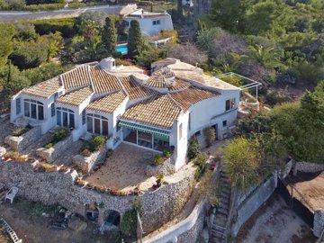 The villa is situated in Portichol and offers breathtaking sea views. Spread across two levels' the main floor features a grand living/dining area with large windows that connect seamlessly to the outdoor terraces' as well as a fully equipped kitchen' three bedrooms' and three bathrooms. On the lower level' a charming guest apartment comprises a cosy living room with a fireplace' one bedroom' and one bathroom. At the upper end of the plot' a second building houses two additional bedrooms' a storage room' a toilet' and a solarium with spectacular sea views. The Mediterranean garden' spread across different levels' blends harmoniously with the property and features a pergola' garage' and storage space. Additional highlights include underfloor heating' handcrafted terracotta flooring' and air conditioning throughout.