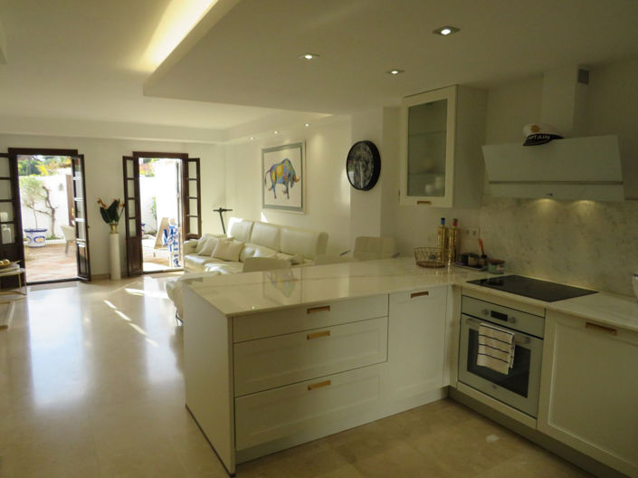 BEACHSIDE TOWNHOUSE ESTEPONA…….. Let us proudly present this stunning and newly renovated townhouse located just 200 meters from the beaches of Estepona. This property comprises 3 large bedrooms, 1 small bedroom and 2 bathrooms spread over 3 floors. On the ground floor entrance level you have a large a bright living room with a good size and fully fitted open plan kitchen and a large patio terrace which faces west ensuring lots of sun from noon until the end of the day. On the second level you have the master bedroom which is en-suite and has a west facing Juliette balcony and the second bedroom which is also a good size and faces east. Up another level and you’ll find the third bedroom which is again en-suite and like the master bedroom has a west facing Juliette balcony, also on this level you’ll find the fourth, smaller bedroom which could also be used as a study.