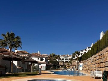 The two spacious bedrooms have built-in wardrobes and en-suite bathrooms, providing extra comfort. The community boasts several well-maintained swimming pools, perfect for relaxation. The surrounding area offers the tranquillity of the golf course and the proximity to the beach.