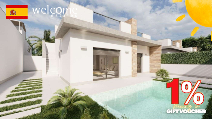 THIS PROPERTY INCLUDES A 1% WELCOME ESTATES GIFT! Which can be redeemed for white goods, furniture lighting and much more. NEW BUILD SEMI-DETACHED VILLAS IN ROLDAN New Build luxury complex of one or two levels semi-detached villas in Roldan. You have an option of semi-datached villas with two bedrooms, two bathrooms build over one floor with solarium or with three bedrooms, three bathrooms build over two floors with lalrge terrace. On the top floor, on the terrace or solarium you will have a summer kitchen that allows you to enjoy all hours of sunshine, every day of the year. All villas has private garden with with pool and parking space. Designed with a contemporary style and open-planned concept, comprising a fully-fitted kitchen and lounge-dining-room. The development is located in Roldán (Murcia), within a gated and security control resort. Is near the beach, surrounded by services, parks, sports facilities and several Golf Courses. The property will meet the highest standards and will be equipped with: Private swimming pool preinstalled for heating system and with solar shower. Kitchen completely furnished and equipped with oven, microwave, fridge, integrated dishwasher and extractor fan. Also, central wooden island. Lighting: LED inside the property as well as in outdoor areas. Lined wardrobes with drawers. Fully fitted bathrooms with suspended toilet, shower screens, vanity unit, mirror with light and rainfall shower. Summer kitchen in solarium. Pre-installation for ducted air-conditioning. Parking space on the plot. Roldan itself is a traditional town with all the local amenities you will need including Supermarkets, Restaurants, Bars, Health Clinic, Pharmacy, Police Station, Petrol Station, Mechanics, Dentists, Doctors and more. The nearby golf resorts of La Torre, & Terrazas are easily accessible, Corvera Airport is fifteen minutes away & the beaches of the Mar Menor just twenty minutes drive.