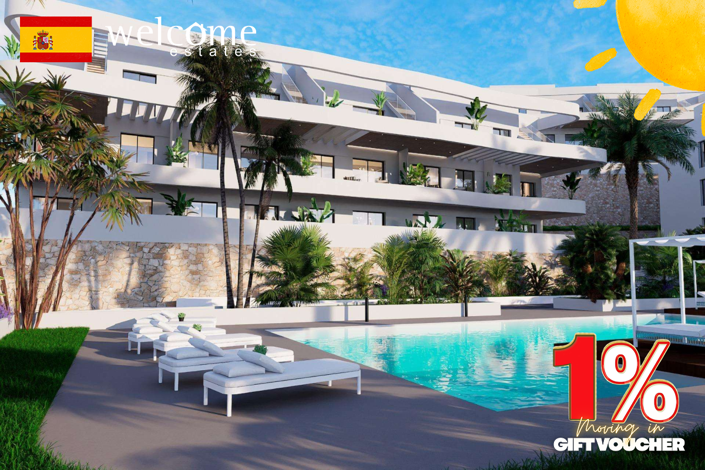 THIS PROPERTY INCLUDES A 1% WELCOME ESTATES GIFT! Which can be redeemed for white goods, furniture lighting and much more. NEW BUILD RESIDENTIAL COMPLEX IN FINESTRATNew Build residential complex in Balcon de Finestrat.This complex of modern apartments with two bedrooms, two bathrooms, open-plan kitchen with the living area. Some of the apartments will have sea views.Ground floor apartment with a private gardens, middle floor apartments with the terraces and top floor apartments has a terraces and private solariums.Each property has private underground parking space.The properties have access to the communal area with 3 swimming pools, parking, paddle, playground, calisthenics. It is a great opportunity and privilege to be able to live with this environment of golf and beach, very near to all amenities of all services considered one of the best places to invest.Finestrat situated in the Marina Baixa region of the Costa Blanca.Benidorm is just a five-minute drive from the properties and offers all the services you would need including shops, bars, restaurants, supermarkets, banks, pharmacies and several private international schools.Close to the beaches of Levante, Poniente and Cala de Finestrat, with more than six kilometres in length that are among the best in Europe awarded by the European Union with blue-flags.All leisure services such as the theme parks of Aqua Natura, Terra Mítica, Terra Natura, Aqualandia and Mundomar, Sierra Cortina and Villaitana Golf courses, hiking and climbing in Puig Campana an incomparable natural setting or enjoy of nautical sports.Distance to the sea 4 km, to the airport 26 km and to the golf 1km.