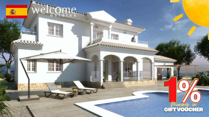THIS PROPERTY INCLUDES A 1% WELCOME ESTATES GIFT! Which can be redeemed for white goods, furniture lighting and much more. NEW BUILD VILLAS IN PINOSOYou can choose Villas with traditional Spanish touches or super modern finishing, bright and clean. Different legal building plots available (rustic with minimum 10.000m2), some walking distance to town, some totally private and our most popular ones are within 5-10 mins drive to a town. We have a plot for every taste, all with amazing views and all have mains water + electric included in the price and high speed internet available. From the biggest and best builder in the area and use top quality materials for a perfect finish. All houses include 2m stamped concrete terrace around the pool (colour and pattern to choose), 1m around the house, gated entrance, 3.000m2 fencing, pre-installed ducted aircon, standard kitchen, security door, german tilt and turn windows (or sliding if prefered), built-in fireplace and chimney, pre-installation for tv and internet, gravel driveway plus a few meters around the house, septic tank. Bathrooms include a shower column, shower tray or bath, sink units (various colours to choose from) with sinks, taps and mirrors, plus a big selection of wall tiles. Wide selection of ceramic floor tiles, different colours, wood effect, etc. Kitchens include cabinets with standard doors and handles, as per plans provided, stainless steel sink and tap, pre-installation for oven, dishwasher, extractor. Various granite worktops to choose from included in the budget, other stone worktops available as extras. White goods not included. Marble staircase (cream, white, or grey) and railings included, plus railings for the front porch. Big fixed glass window on the staircase for extra light. Choice of tiles and steps design for swimming pool. Choice of the granite for the houses' exterior steps and window sils. You can customise the house to suit, most internal changes are free of charge, the houses can be extended and we can even build your own design. Upgrade to bigger pool, single or double garage, guest house, etc. at an extra cost.The beautiful and thriving town of Pinoso is approximately forty-five minutes inland from Alicante and the white beaches of Costa Blanca and very near to the Murcia, Alicante borderIt has a population of just under 8,000. Pinoso, also known as El Pinos is named after the pine trees that cover the areas mountain ranges. Pinoso provides a Spanish rural lifestyle, no traffic lights, hardly any traffic, practically the only jams are caused by the tractors taking the grapes to the Bodega. The fields are planted with vines, almonds and olives. In February the fields are filled with pink almond blossom.Pinoso has many bars, restaurants and shops, a new 24 hour medical centre, dentists, two primary schools and 1 secondary school, a theatre. There's an excellent Sports Centre with outdoor swimming pools, tennis courts, football pitches and gymnasium, library and many other facilities including a beautiful picnic area among the pines, complete with barbecues, seating areas and running water.