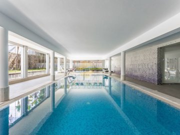The lower floor boasts a heated indoor pool, surrounded by sliding glass doors that open to the garden, creating a perfect harmony between indoor and outdoor spaces. To complement this, a sauna and gym/game room provide all the amenities for relaxation and fun.