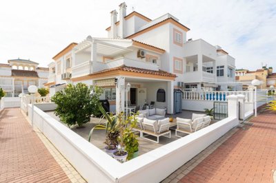 Townhouse with corner location, large patio and terrace. Pool area. A warm welcome to this well-planned townhouse with an attractive corner location in the popular area of Zeniamar on the southern Costa Blanca. Here you live close to nice beaches, shops and restaurants. A few kilometers away is the large La Zenia Boulevard shopping center and several well-known golf courses.
