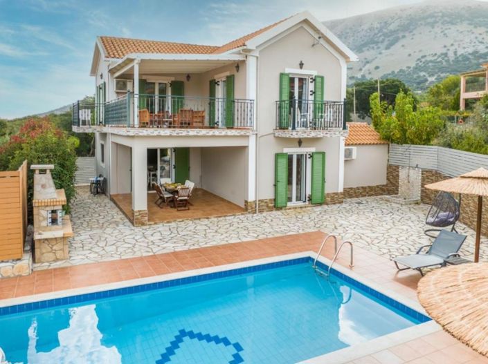 Nestled in the traditional village of Potamianata, where the natural beauty of Kefalonia meets absolute serenity, lies this high-aesthetic villa. This atmospheric 120 sq.m. residence, set within a lush 1,018 sq.m. plot, offers the ideal sanctuary for those seeking Ionian authenticity without compromising on comfort and luxury. The property spans two levels, meticulously designed with an emphasis on natural light and functionality. The ground floor features a seamless, sun-drenched open-plan layout that hosts the living room, dining area, and a fully equipped kitchen, creating the heart of the home. This level also includes a comfortable bedroom and a full bathroom. An elegant internal staircase leads to the upper floor, which houses two additional spacious bedrooms and a second bathroom. The expansive balconies on this level offer panoramic, unobstructed views of the verdant Pylaros landscape-the perfect backdrop for relaxation at any time of day. The outdoor area is a true oasis. A crystal-clear swimming pool takes center stage, surrounded by ornamental plants and a stylish paved lounge area, ideal for peaceful moments under the Greek sun. The imposing stone-built wall enclosing the property ensures total privacy and adds a touch of classic prestige. Strategically located just a stone's throw from the world-famous Myrtos Beach and the picturesque harbor of Agia Efimia, this villa combines the tranquility of village life with immediate access to the island's premier attractions. Featuring 3 bedrooms, 2 bathrooms, and excellent accessibility (29 km from Argostoli and 36 km from the airport), this property stands as a top-tier proposition in the Kefalonian market-whether as a premium holiday home or a high-yield investment for tourism exploitation.