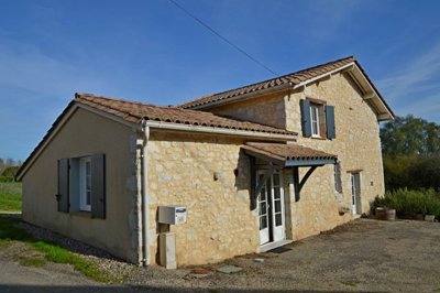 Charming, renovated stone house nestled in a peaceful rural hamlet with lovely views, this bright and inviting home is located 10 km from Duras and 14 km from Sainte Foy la Grande. With 110 m2 of habitable space the house features on the first floor two bedrooms, a bathroom and a landing that can be used as an office space. On the ground floor as well as a large living room you will find a room suitable for a spacious ground floor bedroom or additional living space + a shower room. 1 002 m2 of land + basement for storage / workshop. Open plan living room with fitted kitchen: glazed door opening on to the terrace. 44 m2. Room / bedroom 1: 21.40 m2. Shower room: shower + basin. 3.78 m2. WC.First floor - Landing: 10.50 m2. Bedroom 2: 10.36 m2. Bedroom 3: 9.90 m2. Bathroom: bath, basin + WC. 7 m2. Basement: 44 m2.Oil fired central heating. Double glazing. Rolling blinds or wood shutters. Fibre available. Individual drainage. 1 008 m2 of garden. “Information on the risks to which this property is exposed is available on the Georisques website: