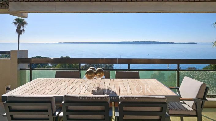 In a top-of-the-range residence with swimming pool, this corner apartment features a vast terrace and a breathtaking view of the sea, the Lérins islands and as far as the Estérel.