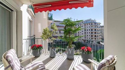 Situated in a luxurious residence between the Croisette and Rue d'Antibes, this stunning 110 sqm apartment with a terrace and balcony has been recently renovated. It features a spacious 41 sqm living room, a master bedroom with an en-suite shower room, two additional bedrooms, a separate shower room, an independent Wc, and a fully equipped kitchen. In the basement a confortable size garage comes with this rare apartment.