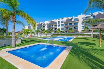Residents enjoy access to exceptional communal facilities including two swimming pools, a jacuzzi area, gym, childrens playground, petanque zone, and a scenic park. With Villamartin Golf and Villamartin Plaza just 4 minutes away and other golf courses and beaches nearby, this location offers both leisure and lifestyle.