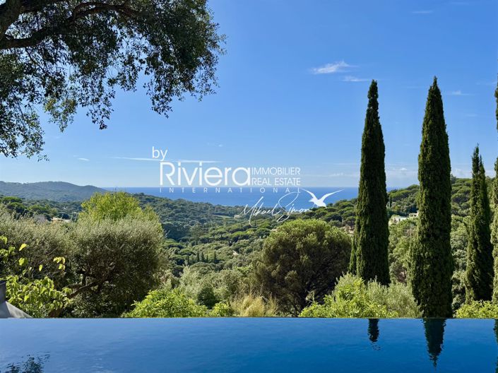 Gigaro! Superb property of very high standing, in an impeccable, with luxurious finishes, Located in an exclusively residential and highly sought-after domain, this property of 380m2 on more than 11,000m2 of land offers you a superb sea view and a prestigious environment.... Composed of two connected buildings, with 2 swimming pools (one of 14m x 6 and a second of 9m x 3.5m). The main house consists of a living room with an impressive volume, benefiting from a dominant view of the bay and Cap Lardier, with this first infinity pool placed as an extension of the living room and its terraces. A large, very bright dining room extends this remarkable living space, as well as a large contemporary kitchen open to all volumes... The Master bedroom, still facing the sea, will welcome you with a very large bathroom, dressing room and terrace... The second body of the property in extension will offer you all the high-end comfort for your family or your guests with a very beautiful living room, a kitchen, an office, and 4 bedrooms and 3 bathrooms. You will also discover an outdoor studio for the staff. The garden of more than 11,000m2 planted with Mediterranean species will allow you to discover the second swimming pool of 14m x 6m, its teak terraces and its superb pool-house with contemporary architecture and composed of an American kitchen, a bar, a large gym, a sauna and finally a jacuzzi. Double garage - Alarm - Automatic gate. A true haven of peace in a luxurious environment, a very high-standing property....
