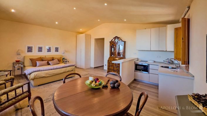 Set on the third floor of historic palazzo, endless views as far as Lake Trasimeno for sale in Città della Pieve. Set within an elegant 19th-century palazzo in the very centre of Città della Pieve, this restored top-floor apartment offers sweeping panoramic views that stretch as far as Lake Trasimeno. The apartment, arranged entirely on one level, measures some 69 square metres (742 sq ft) and has been renovated with great care, respecting the character of the original materials while introducing thoughtful contemporary touches. The interiors are warm and welcoming, with natural light, mellow tones, and wood finishes creating an atmosphere that is both cosy and refined. The living space is open-plan, incorporating a fitted kitchenette and a sitting area that currently accommodates a double bed. There is a comfortable double bedroom with en-suite bathroom, as well as a second guest bathroom — all designed for ease and comfort. Enjoying uninterrupted views over the rooftops and rolling Umbrian countryside, this property is ideally suited as a private pied-à-terre, a second home, or a stylish holiday retreat. Its prime location offers easy access to local amenities, as well as excellent connections to highways and main attractions. PROPERTY Ref: CDP3308Location: Città della Pieve, Province: Perugia, Region: Umbria Type: 69 sq m/742 sq ft apartment set on the 3rd floor of a period buildingYear of construction: 1800 Conditions: excellent Layout: Third Floor: open plan living with kitchenette and lounge, 1 bathroom, 1 bedroom with ensuite bathroomDistance from services: walking distance Distance from main airports: Perugia 50 km/31 miles, Florence 110 km/68 miles, Rome Ciampino 160 km/99 miles, Rome Fiumicino 190 km/118 milesUtilities: Fixed telephone network: available; Internet: broadband; Heating: methane; Water: municipal water network; Electricity: activeThe property is owned by a private individual. The location, for privacy, is approximate. Please note all measurements cited are approximate.Energy Efficiency Rating: GApolloni & Blom RE conducts technical due diligence with the owner's technician to have a full report on each property's urban and cadastral state of the art. The due diligence may be requested by clients showing a strong interest in the property.