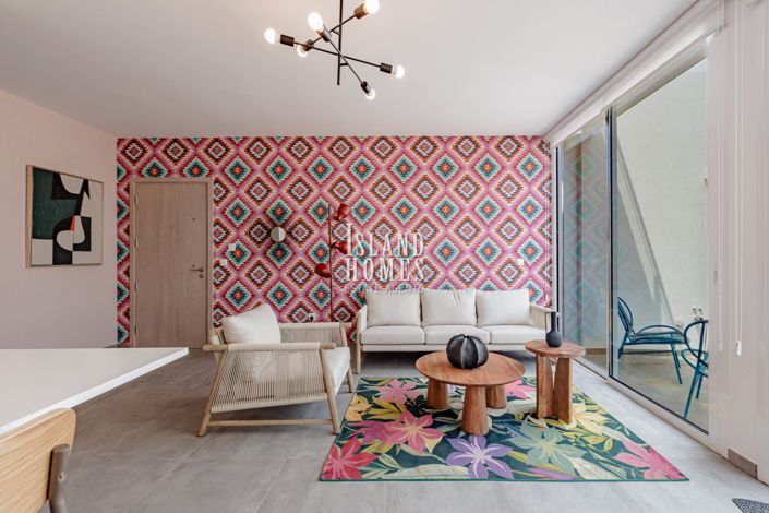 Offered for sale fully furnished ready to move straight in, this stunning and stylish ground floor apartment has an open plan design, consisting of kitchen, dining and living area. The current owners have spent a great deal of time to ensure the property is not only effortlessly modern but comfortable at the same time. The spacious living area offers plenty of natural light from the wall to wall patio doors which allow access to the garden. From a short corridor you find access to the guest shower room, main bathroom and both bedrooms. The bedrooms, double in size, continue the theme of striking wall paper and statement features and also include built in wardrobes. This particular property features a very generous 119m2 garden, a great place to sit and read a book during the warm summer evenings with plenty of room for dining al fresco and entertaining family and friends. The garden is currently a blank canvas ready for you to create a tropical oasis.