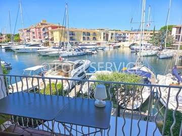 Quiet residential area, apartment with lovely view, mooring. The first-floor apartment comprises a living room with a kitchen bar, a terrace, a bedroom, and a shower room with Wc. The mooring is 14m long and 3.12m (at the quay) and 4.52m wide, with a numbered parking space at the end.