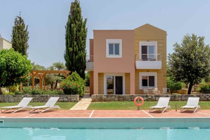 Located in the peaceful village of Chorafakia on the Akrotiri peninsula near Chania, this elegant detached villa is part of a private gated development of five individually designed homes. Offering the perfect blend of exclusivity and shared amenities, the development sits on a total land area of 2,285 m², where manicured gardens, stone walls, and mature landscaping create an atmosphere of Mediterranean charm.