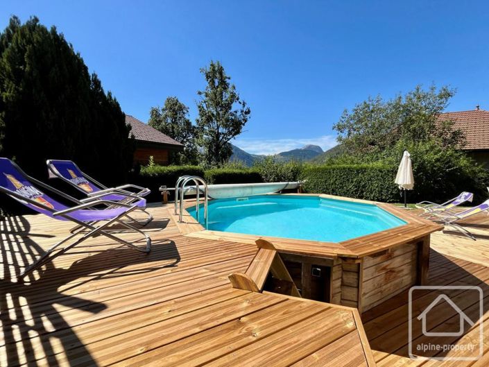 Built in 1996 on a 830 m² plot, the chalet enjoys a lovely flat, lawned garden in front of the south-facing façade, from where you can admire part of the Aravis mountain range. A highlight of the property is its above-ground swimming pool, seamlessly integrated into a brand-new wooden deck — an ideal setting to enjoy sunny days with family or friends.