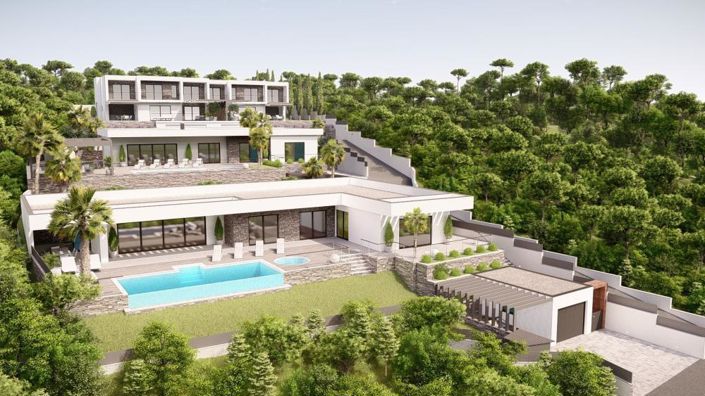 The garden of each villa includes a large garage for two vehicles, an infinity pool, a garden, a barbecue zone, and additional terraces and a sunbathing area.