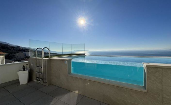 In this villa you will find four spacious bedrooms, each with its own bathroom and a training and recreation room that will provide you with complete privacy and luxury. A spacious salon space illuminated by natural light creates a perfect environment for relaxation and socializing. Each floor of the villa has its own terrace that invites you to enjoy the views and fresh air. What makes this villa special is its swimming pool, which is located on the terrace of the highest floor, from which a spectacular panoramic view of the Kvarner Bay is offered.
