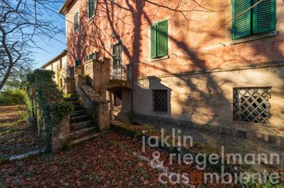 1st floor (426) m² with living, sleeping and working rooms. Spacious Tuscan kitchen with fireplace and dining area, six bedrooms, three of them with bathroom, bathroom, study, living room with fireplace, hallways, playroom. From the kitchen there is access to the large terrace with panoramic views. From here an external staircase leads to the courtyard where there are various outbuildings, the back of the chapel and the factor house. From the hall, an external staircase leads to the garden, where there is a brick well. The entire floor is equipped with an electricity, water and heating system with convector heating.