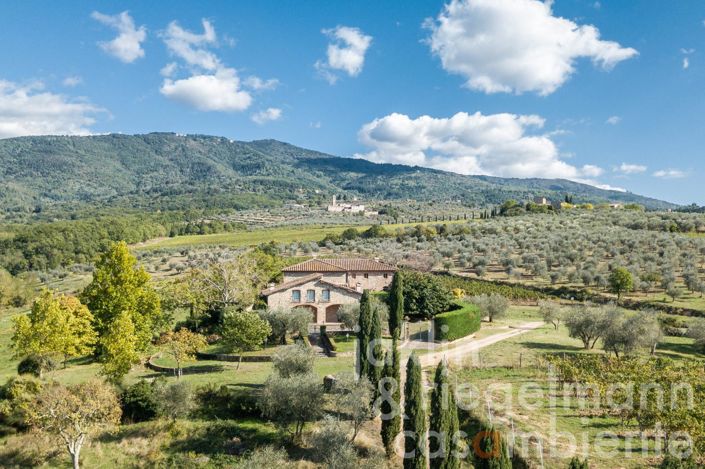 Nestled in the rolling hills of Reggello, an area renowned for its breathtaking landscapes, rich history, and exceptional olive oil, this elegant estate for sale offers an authentic Tuscan living experience. A stately cypress-lined driveway leads to two beautifully restored country houses, both facing south and surrounded by olive groves and vineyards, evoking the timeless charm of the region.