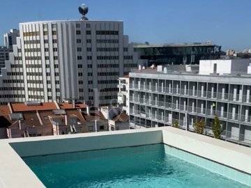 Through the living room we have access to the second floor of the apartment, where we find the terrace with the private pool. Panoramic view over Lisbon.