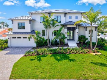 One or more photo(s) has been virtually staged. Experience the ultimate in island living in this brand-new custom built waterfront residence located within the prestigious Country Club Shores community at the south end of Longboat Key. Designed with high performance and easy maintenance in mind, this solid all-block, two-story coastal contemporary residence blends timeless island elegance with state-of-the-art finishes. Spanning nearly 3,800 square feet, the home boasts an open-concept plan offering a seamless flow for entertaining while ensuring privacy for the owners and their guests. Soaring 11 '4 " ceilings highlight the main level with 10-foot sliding glass doors and transom glass over tall casement windows that fill the interiors with natural light. At the heart of the home, a thoughtfully created gourmet kitchen and wet bar are a showpiece, featuring tailor made cabinetry in a fabulous mix of custom-painted thin shaker and rift-cut white oak materials. Mykonos, a stunning polished quartzite, accents the ceiling-height hood, waterfall island countertops, and full-length backsplashes. A luxe Wolf and Sub-Zero appliance suite including a contemporary gas cooktop, twin 30” refrigerator & freezer towers, an 18” wine tower, and an under-counter beverage center creates the perfect setting for effortless entertaining. The first-floor primary suite retreat features a wood slatted tented ceiling with expansive glass windows and direct access to the covered patio. The primary bathroom showcases large-format porcelain tile, textured ribbed wall accents, a relaxing freestanding soaking tub, dual vanities and custom lighting details. An inviting staircase leads to an elevated private study with half bathroom while on the second floor, a spacious game room with full wet bar serves the three additional guest en-suite bedrooms. Anchored along the back is a long covered balcony to enjoy sweeping water views and soft gulf breezes. Modern living is enhanced with Control4 Smart Home automation, keypad lighting, integrated window treatment controls and pre-wired for personalized sound and security systems. Comfort and efficiency are ensured with dual 17 SEER HVAC systems, spray foam insulation, natural gas tankless water heater, ES Low-E impact glass windows and doors, WiFi thermostats, and a pre-planned EV charger line option in the garage. Outside, a lush resort-inspired retreat awaits. A striking 40-foot linear pool with a 12-foot sun shelf and spa shimmers against French-pattern Crema Nova marble decking. The expansive lanai invites alfresco living with generous spaces for dining, lounging, and entertaining, complete with Naturekast outdoor kitchen cabinetry, a 42” gas grill, and an under-counter beverage center. The property is further enhanced by a brand-new seawall with a 28” concrete cap, along with a professionally designed tropical landscape package featuring vibrant plantings, soaring triple Montgomery Palms and stately Coconut Palms. This special opportunity provides an unparalleled lifestyle offering the perfect balance of luxurious modern design with effortless coastal comfort just minutes from the vibrant open-air shopping and dining of St. Armands Circle, the world-class arts and cultural events of downtown Sarasota, and, of course, the island’s spectacular Gulf beaches!