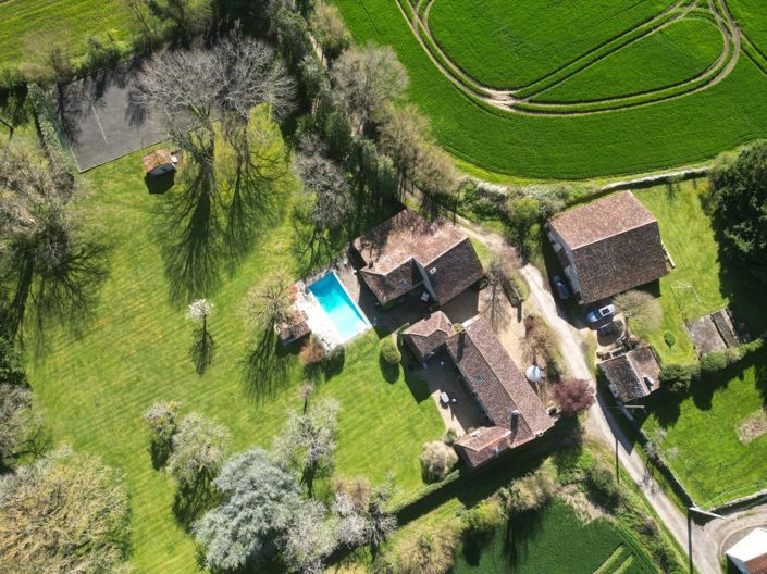 Rear terrasse overlooking the park gardens, heated swimming pool, fully equipped summer kitchen and covered outside dining area, and tennis court.