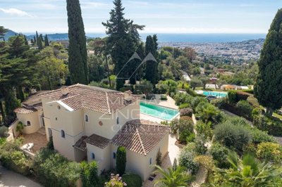 Set within a private and immaculately maintained estate, this elegant Provençal-style villa, built in the 2000s, enjoys a commanding south-facing position offering spectacular panoramic sea views stretching as far as Cap d'Antibes.