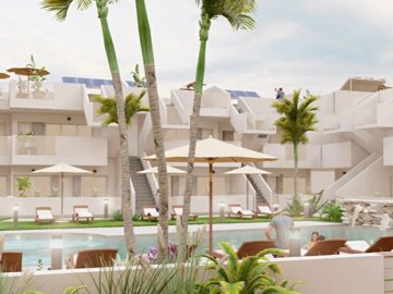 Gated resort with options for 2/3 bedrooms and 2 bathrooms, terrace on the first floor and solarium for the upper floor. The interiors, elegant and functional with high quality flooring, fully ?tted kitchens including electrical appliances. The bathrooms have a vanity unit with washbasin and light. The bedrooms include lined wardrobes with drawers and sliding doors and each property has pre-installation for ducted air conditioning.