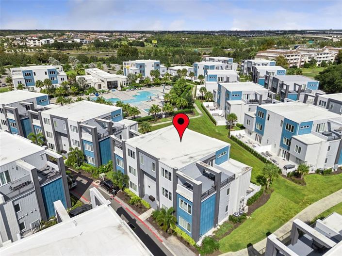 Step into luxury and incredible investment potential with this breathtaking, fully furnished 5-bed / 4.5-bath condo at 7770 Sandy Ridge Drive, #223 in Building 20 of the highly desirable Spectrum at Reunion. Perfect for multi-generational families and smart investors alike, this home boasts a handicap-accessible elevator—making grocery unloading a breeze and commanding a premium rental rate due to its enhanced accessibility. The expansive living space features a unique and highly desirable bed configuration to maximize guest capacity, including two master suites (one king, one with two full beds), a Jack and Jill suite with a queen bed in each room, an additional king suite upstairs, and a sleeper sofa. Every detail is included, from stunning artwork and mirrors to silverware and linens, offering a truly turnkey experience. The crown jewel is the private rooftop deck with an added awning upgrade, providing a serene outdoor gathering space to enjoy both sunshine and shade, overlooking a lovely green space for kids to play.