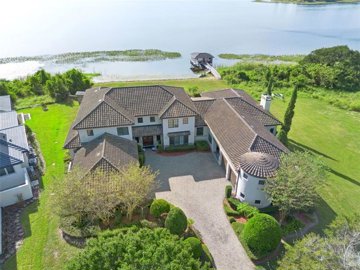 Spectacular lakefront estate in the Magnolia Pointe community! Built in 2007 by Master Builders, this single-story custom home offers ˜ 7,010 sq ft of luxury living on nearly 1 acre. Step inside to soaring ceilings, a grand staircase, and an open floor plan with breathtaking, unobstructed views of Johns Lake. The gourmet kitchen is a chef’s dream with premium appliances including a Sub-Zero refrigerator, convection oven and steamer, warming drawer, granite countertops, and a large butler’s pantry. The primary suite offers stunning lake views, dual custom walk-in closets, a spa-style bath with dual vanities, dual showers, a 6-foot Jacuzzi tub, and his & hers facilities. Additional spaces include a home theater, game room with wet bar, wine cellar, library, two offices, and dual laundry rooms.