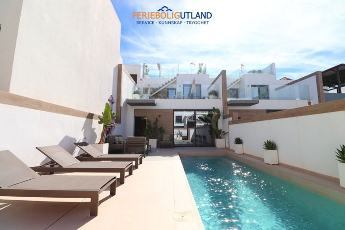 This Family Sized, Three Bedroom, Townhouse in Benijofar is located in this highly sought-after and well-established town, serviced by an abundance of amenities including a supermarket, café bars, restaurants, bank, pharmacy, vets, bakeries, school, sports ground, park and lake, medical centre, and modern commercial centres. La Marquesa Golf Course is just a 10-minute drive away, while the beautiful Costa Blanca South beaches are reachable in approximately 12 minutes. This outstanding home was built only 3 years ago, ideal for a family with its 171m² distributed over three levels and finished to a modern, high standard throughout. The main level offers a bright, open-plan living space with large sliding glazed doors leading out to the tiled pool area, along with a sleek, ultra-modern fitted kitchen, a shower room, and a double bedroom. On the first floor are two further double bedrooms, one of which benefits from its own terrace, together with a stylish family shower room. Internal stairs provide access to the under build, currently arranged as an additional lounge/sitting area with a double bed, featuring double sliding glazed doors and another glazed door to a private patio area. This level also includes a cloakroom and a utility/pump room. External stairs lead to the private solarium, complete with BBQ area — the perfect spot to relax and enjoy the open mountain and sunset views. The exterior of the property offers a tiled front garden with off-road parking and a private 6 x 3 swimming pool, ideal for family living or entertaining. A beautifully designed, modern home offering ducted air con throughout, electric blinds plus style, comfort, and convenience in the heart of the Costa Blanca South.