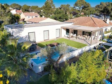 Ideally located 5 minutes from the sea, the center of Saint-Raphaël, and shops, in a sought-after residential area. This beautifully renovated contemporary home offers a rare advantage: it's entirely on one level and built on a flat plot. Its 175 sq m (1,884 sq ft) of living space includes a stunning 71 sq m (764 sq ft) living room with a fireplace, a beautiful open-plan kitchen, and a conveniently fitted utility room. Comfort is ensured by four bedrooms, including a magnificent 23 sq m (248 sq ft) master suite with a beautiful dressing room and en-suite shower room with toilet. Each bedroom features custom-built wardrobes and its own shower room. The decor is modern and refined, with high-quality materials such as double-glazed aluminum windows, reversible air conditioning, and home automation. Its grounds offer ample parking for numerous vehicles, and its inviting outdoor space features a beautiful terrace with a large bioclimatic pergola, a swimming pool, and a jacuzzi. A villa designed for easy living.