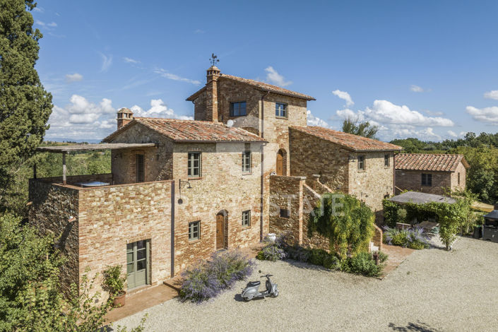 In the main farmhouse, on the ground floor we find a large living room with fireplace, a sitting room, an under-shelf bookcase with openable compartment, a bathroom with brick vaulted ceiling, a spacious rustic kitchen and a lovely wine cellar with brick vaulted ceiling. On the same floor, with an independent entrance, is a comfortable bedroom with ensuite bathroom. On the first floor, accessed by an external staircase, an imposing oak door welcomes us into the living area consisting of a lounge and sitting room with fireplace and overlooking a terrace with a 360° view. The sleeping area consists of a bathroom and 2 bedrooms, one of which is a master bedroom with wardrobe and en suite bathroom. On the second floor, we find a turret consisting of a bedroom and bathroom.