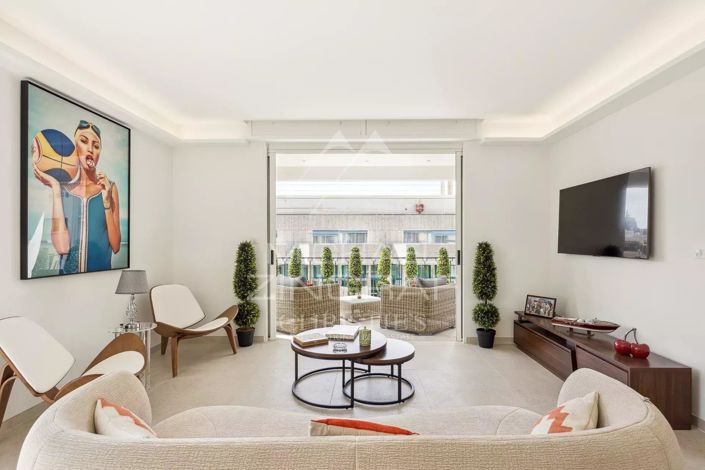 Located in a premium residence in the heart of the city center of Cannes (banane), stunning 78m2 3-room apartment fully renovated with high-quality materials. It features an entrance hall, a vast living room bathed in light and opening onto a sunny terrace, an open-plan fitted kitchen, 2 bedrooms including a masterbedroom with private shower room, a second shower room and a guest toilet.