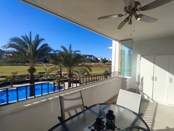 An opportunity to buy a South facing apartment with folding glass curtains across the terrace offering year round useable space. The apartment is located on the end of the block and benefits from a window in the bathroom. Hacienda Riquelme is a beautiful resort with an onsite supermarket, stunning El Cason clubhouse and sips cafe. It is a short drive to Sucina village with a great choice of bars and restaurants along with banks and supermarkets. Murcia airport is a 20 minutes drive and Alicante approximately an hour.