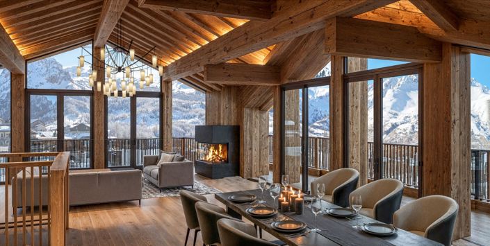 This 237.74 sq.m, four-level chalet combines generous volumes, high-end features, and a warm atmosphere. It offers four bedrooms, including two en suite, and can comfortably accommodate up to 10 guests with both comfort and refinement. The top level features a vast, light-filled living space: an open kitchen, a welcoming dining area, and an elegant lounge, all set within a sophisticated alpine ambiance.