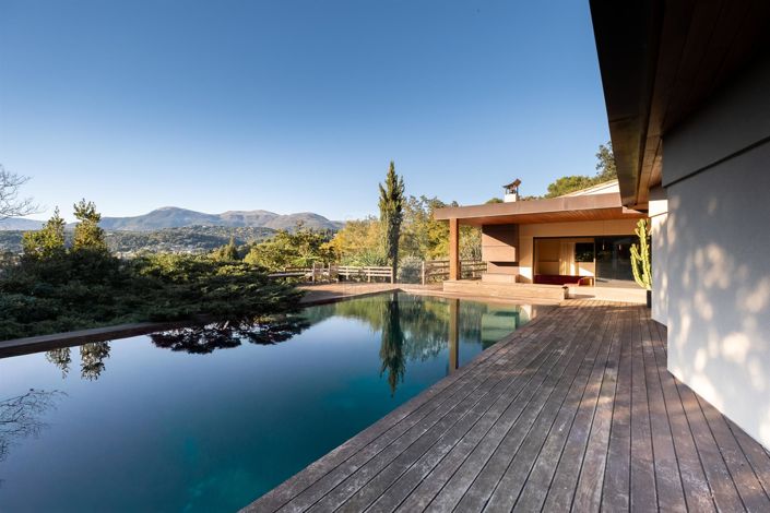 Magnificent contemporary architect-designed villa with 327 m2 situated on a plot of 4638 m2 built in 1971. In perfect condition!!! Ideally located in Southwest exposure. Enjoying panoramic views of the surrounding countryside, this villa comprises a spacious air-conditioned living/dining room with fireplace and mezzanine, a separate fitted kitchen, 3 bedrooms with bathrooms and closets, and a 47 m2 master suite with bathroom, dressing room and toilet, the latter opening onto a very beautiful terrace with a huge swimming pool. On the lower level: an independent apartment of approximately 45 m2, a guest bedroom with shower room and dressing room, a workshop, a technical room and a laundry room as well as a storage space. Huge garage for 6/8 cars. A must-see!!!