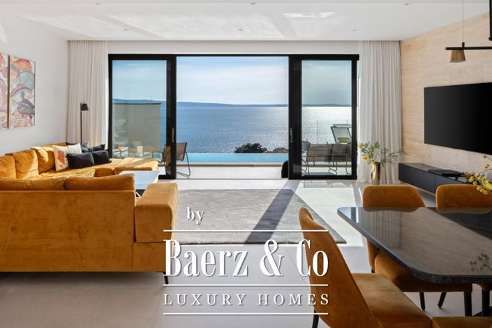 Jesenice, a modern semi-detached villa with a beautiful sea view. It extends over three floors, with a net usable area of 222 m2. It consists of an open-concept living room, kitchen and dining room, 3 bedrooms, 2 bathrooms and one toilet, as well as a beautiful terrace with a swimming pool and a sunbathing area.