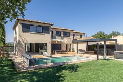 Provence Home, the real estate agency of the Luberon, is offering for sale in Oppède a contemporary house built in 2022, situated in a calm and residential setting with a pool, terraces, and a plot of approximately 751 sqm.